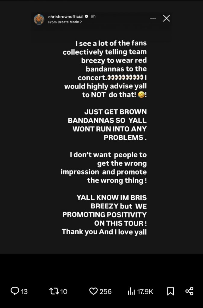 Breezy在他的 IG上发布了一条消息,建议歌迷不要在巡回演唱会上佩戴红色头巾。